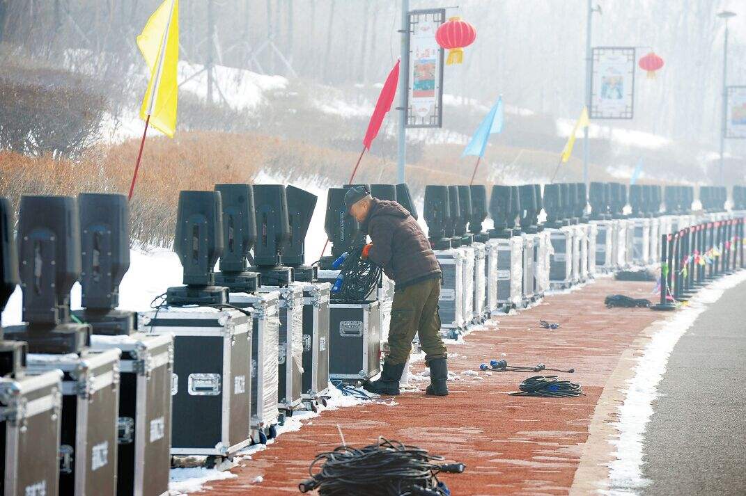 张工拆下一块安装在木板上的光束灯说,小绿谷处于谷底,地势不平,有树木和植物,再加上地面覆盖的积雪,灯光秀布点的难度较大。